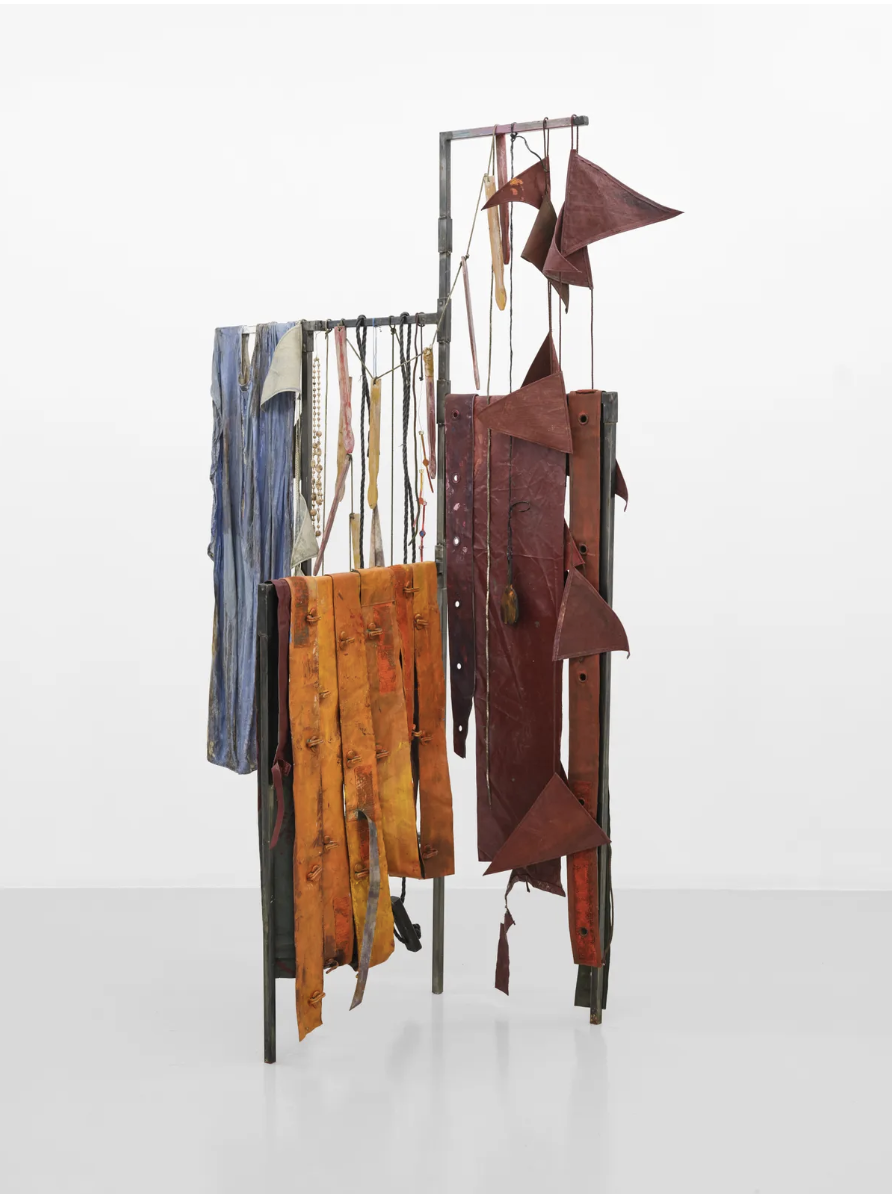 A clock hangs off the apparent drying rack structure of the free-standing sculpture ‘Needful Things’ 2026. Scraps of material hang, like rags attached to a tree, to mark the territory of the past. The second-hand canvas army tent, used by Dennis as a base for paint and marble dust, with layers of action are often broken up to be used as a base, making a three-dimensional indication of actuality. Steel frames allow for an inside and outside of fact. Hanging swathes of canvas acts as evidence of worn, past life itself, as Dennis’s whole process of making something new comes up against – and utilizes – that which is already there.